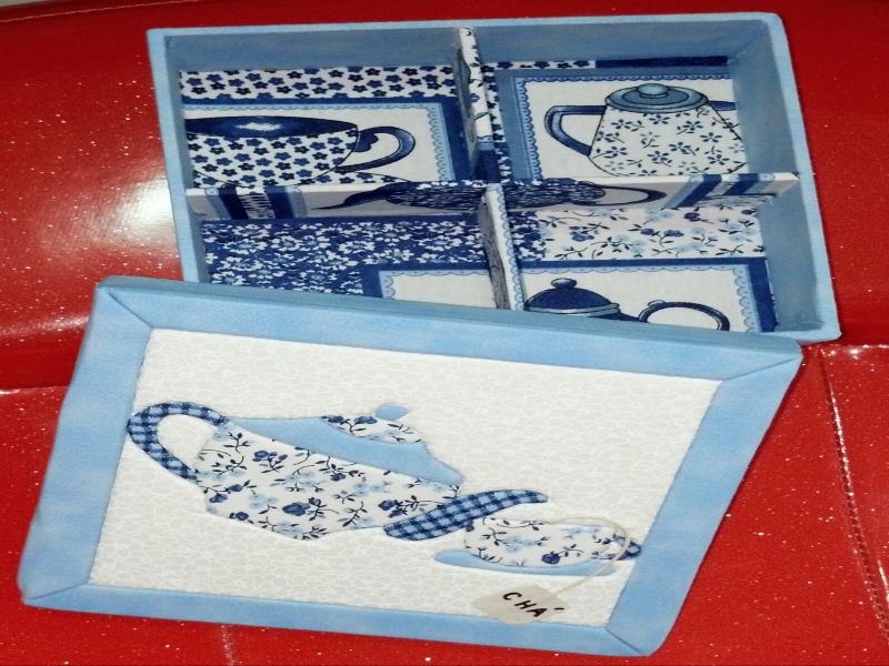 Caixa de Chás personalizada Caixa quadrada com divisórias, toda revestida com tecido e técnica de patchwork embutido na tampa. KK Acessórios e Artesanato.