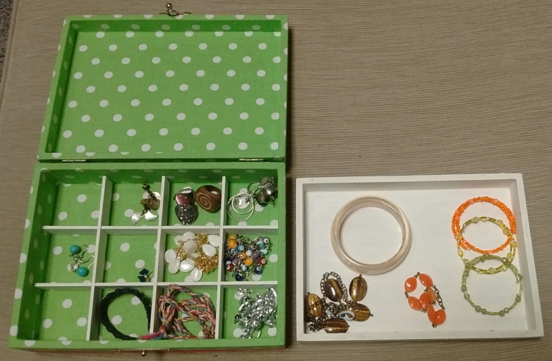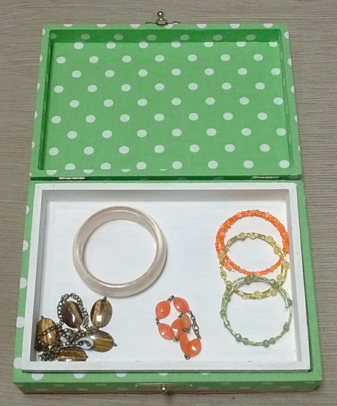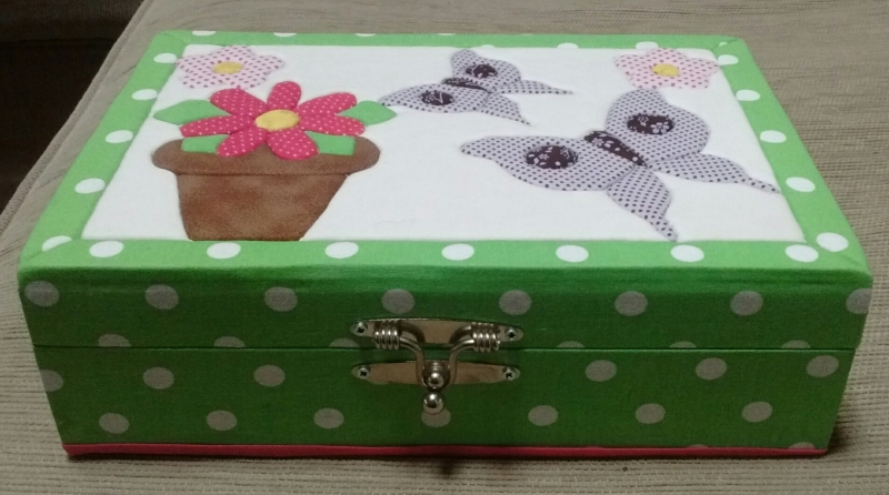 Caixa de jóias toda forrada em tecido com aplicação da técnica de patchwork embutido na tampa e partes internas pintadas à mão.