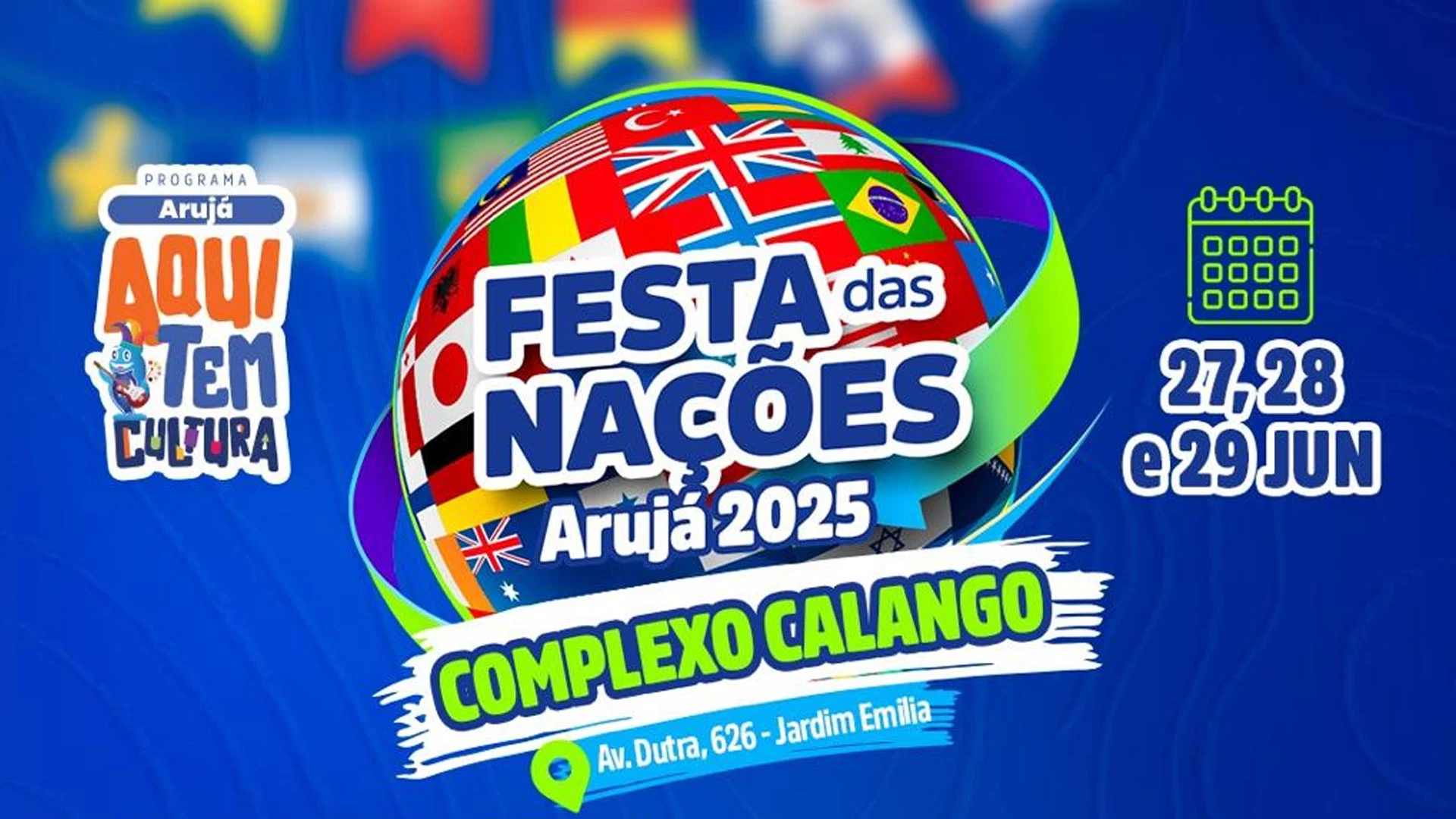 As festividades em Arujá pelos seus 173 anos ainda não acabaram! Este ano, a Prefeitura, pela Secretaria Municipal de Cultura, preparou uma novidade: a Festa das Nações no Complexo Calango, no Jardim Emília, que ocorrerá nos dias 27, 28 e 29 deste mês. A tradicional festa que ocorre na Praça do Coreto há décadas agora será descentralizada, visando atender o maior número possível de arujaenses.