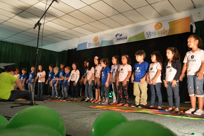 Meia hora mais tarde e acompanhados das mamães, é a vez dos alunos do Musicando Bebês (nove meses a três anos) subirem ao palco para cantigas de roda e brincadeiras.