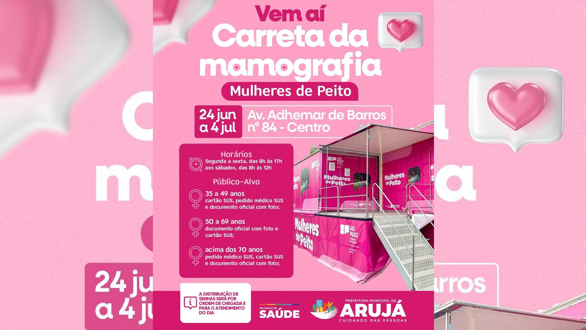 A Carreta da Mamografia, iniciativa do Governo do Estado de São Paulo em parceria com a Prefeitura de Arujá, ficará na cidade do dia 24 de junho até 4 de julho, das 8h às 17h de segunda a sexta-feira e, aos sábados, das 8h às 12h. O local de atendimento será na Rua Adhemar de Barros, 89, no Centro, onde funcionava o antigo supermercado Dia. O público-alvo são mulheres de 35 a 69 anos.