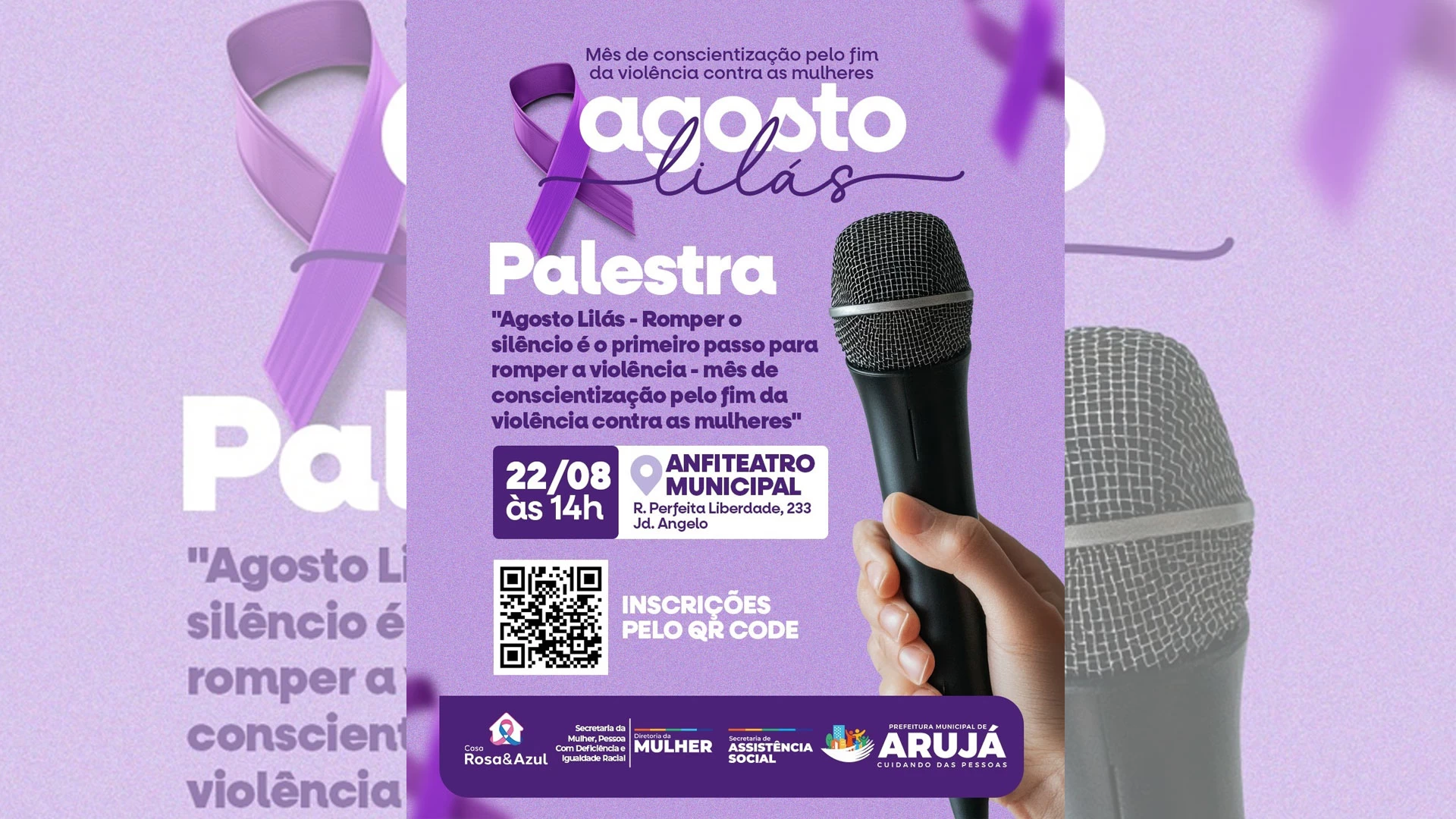 A Prefeitura de Arujá, por meio da Diretoria da Mulher, em parceria com a Casa Rosa e Azul, convida você para uma palestra especial em alusão ao Agosto Lilás, voltada à conscientização e prevenção da violência contra a mulher.