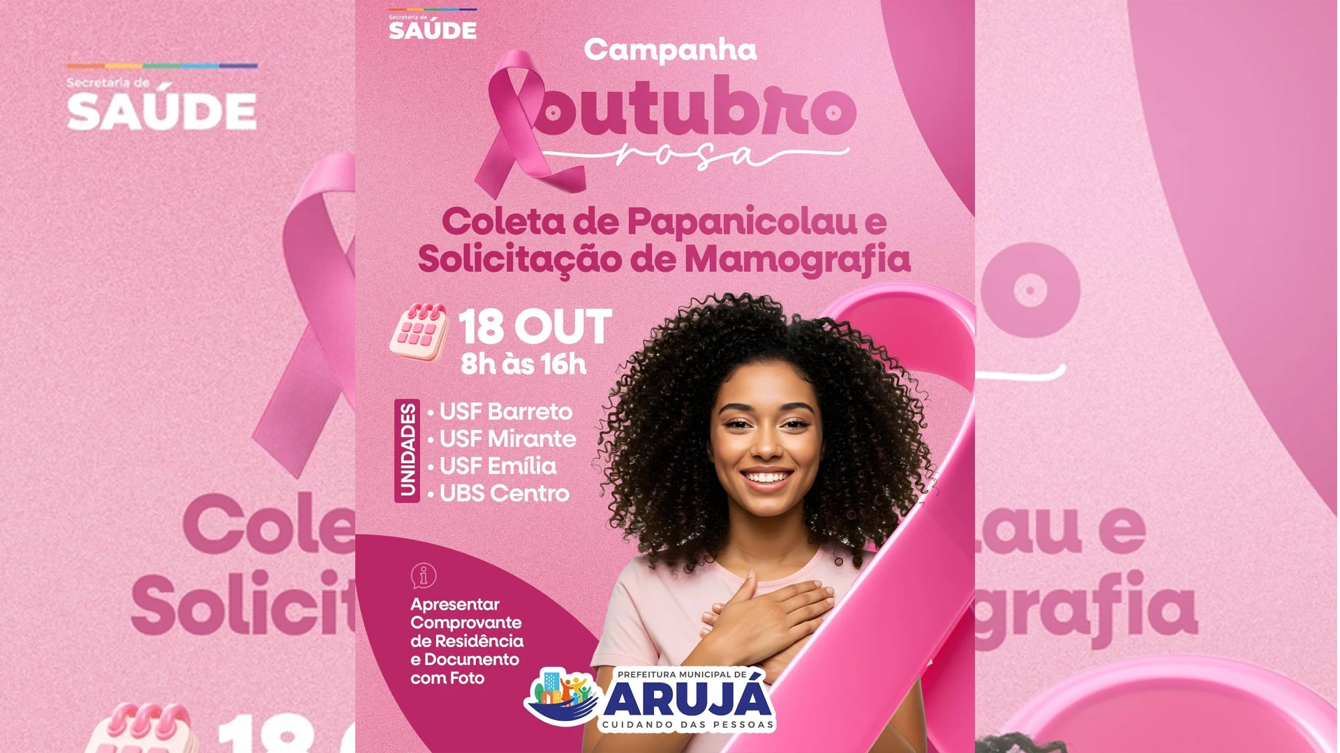 No dia 18 de outubro, a Prefeitura de Arujá, em parceria com a Secretaria Municipal de Saúde, realizará a Campanha do Outubro Rosa, que acontecerá na USF Barreto (Rua Pedro Severino Martins, 231, Barreto), na USF Mirante (Estrada do Kondo, 712, Mirante), na USF Emília (Rua Oscar Schiavon, 390, Jardim Emília) e na UBS Centro (Avenida dos Expedicionários, 1255, Centro), das 8h às 16h.